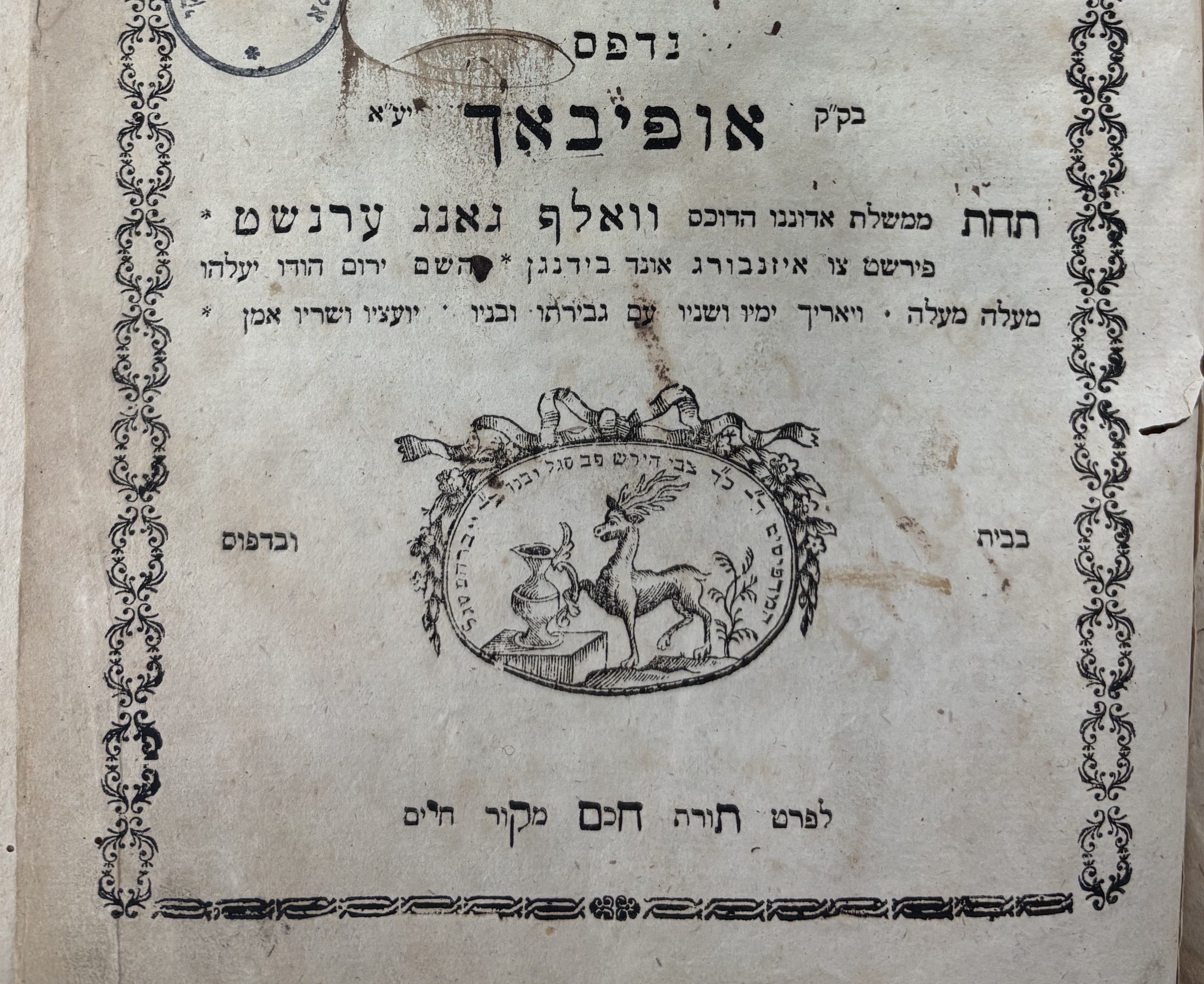 On the title page of Sefer Mekor Hayim (LBI Library, r (f) 215), Hirschel Isaac very prominently praises the man who granted him the privilege, printing his name in bold letters. "Nidpas be k.k. Offenbach [...] tachat mimshlat adonenu hadukas Wolf Gang Ernsht [...]." On the title page, the printer's name appears inside the printer's mark: "ha-Madpisim ... Zvi Hirsch P.B. [Pressburg] Segal ve-benach ... Abraham Segal" ("By the printers Zvi Hirsch Segal of Pressburg and his son Abraham Segal"). The printer's mark shows a deer (probably for the names "Zvi" and "Hirsch," the words for "deer" in Hebrew and German, respectively) and a pitcher, representing the flow of knowledge from the father to the son, surrounded by a wreath.