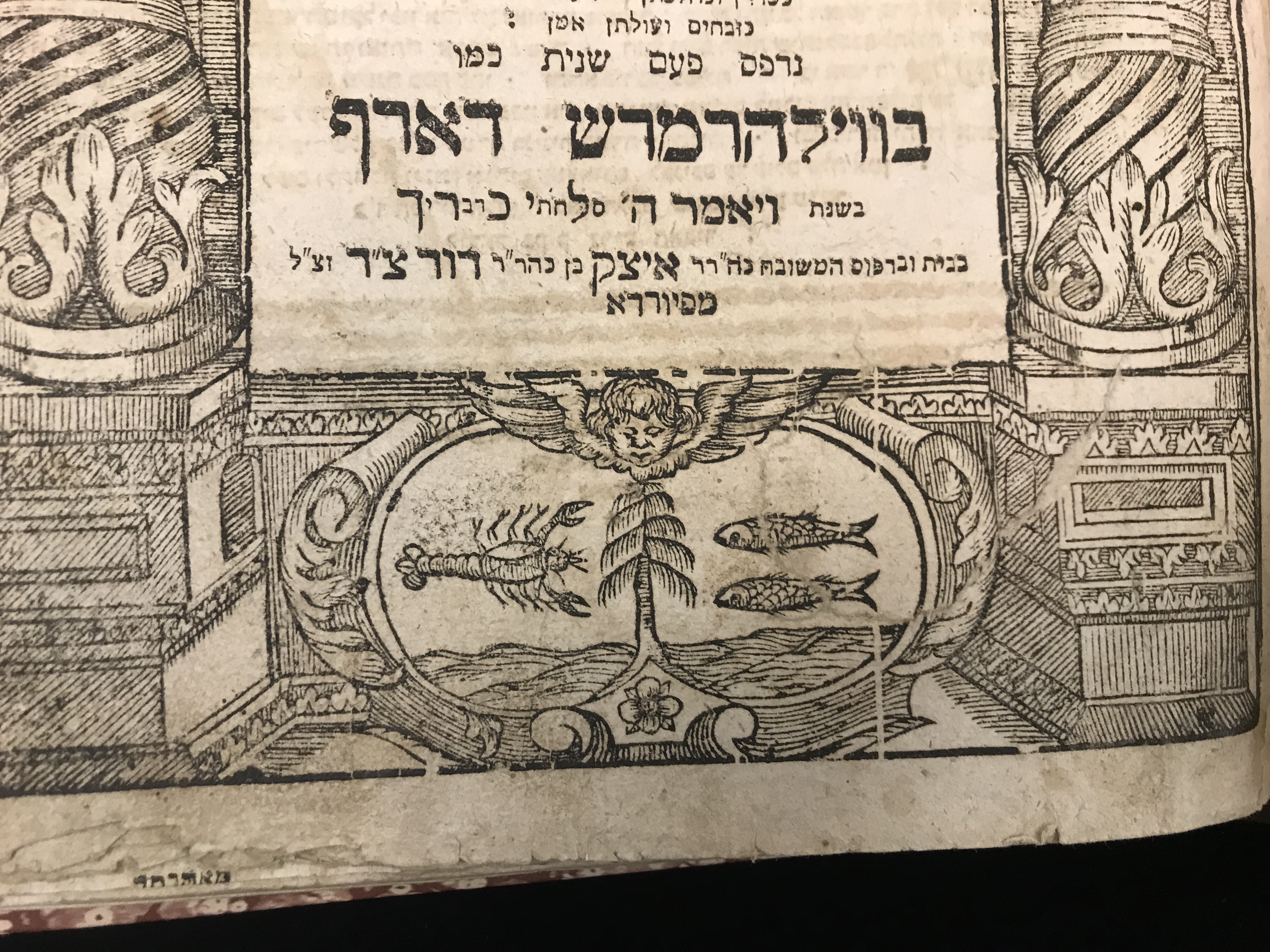 Both books have identical printer's marks showing an angel over a tree of life. On one side is a crab, the zodiac symbol of Capricorn (representing the month of Tammuz). The other shows two fishes, the zodiac symbol for Pisces (representing the month of Adar). The architectural border surrounding the title is designed to look like a portal. Zirndorfer most likely imitated his predecessors, using their printer's marks and title page engravings. The use of this identical printer's marks and architectural border shows the interconnection of the Hebrew printers.