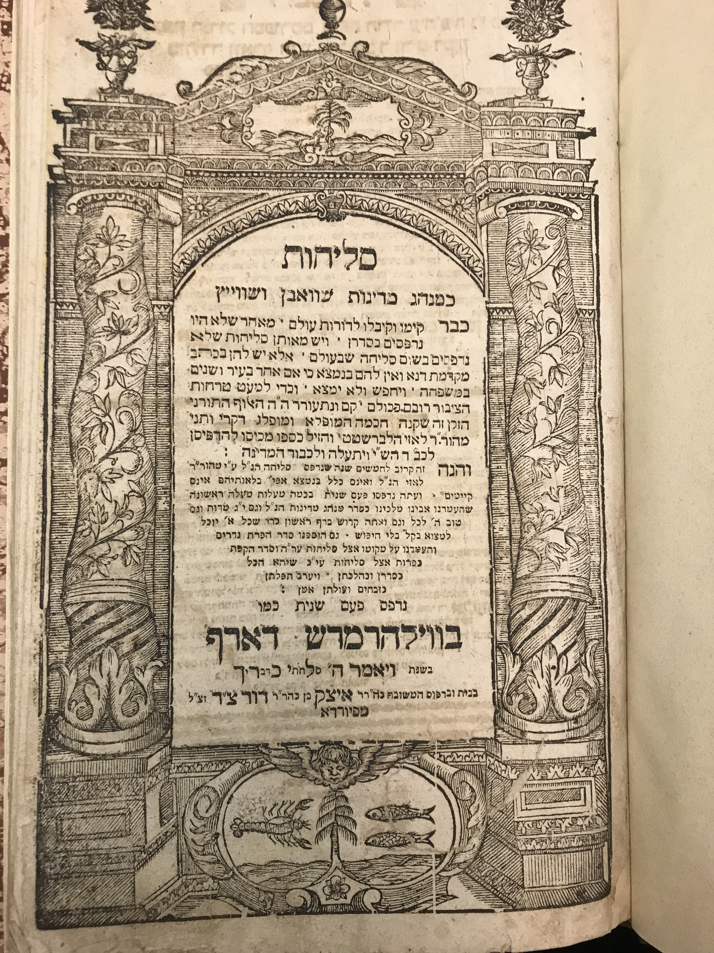 This copy of Selihot ke-minhag medinot Svaben uve Sveis ("Prayers according to Swabia and Switzerland") provides an example of how printing workshops were handed down in families. On first glance, this copy of prayers prominently states that it was printed in Wilhermsdorf. However, a closer reading shows that this printing statement reads "nidpas paʿam shenat kemo be-Wilhermsdorf" ("reprinted once again as in Wilhermsdorf")