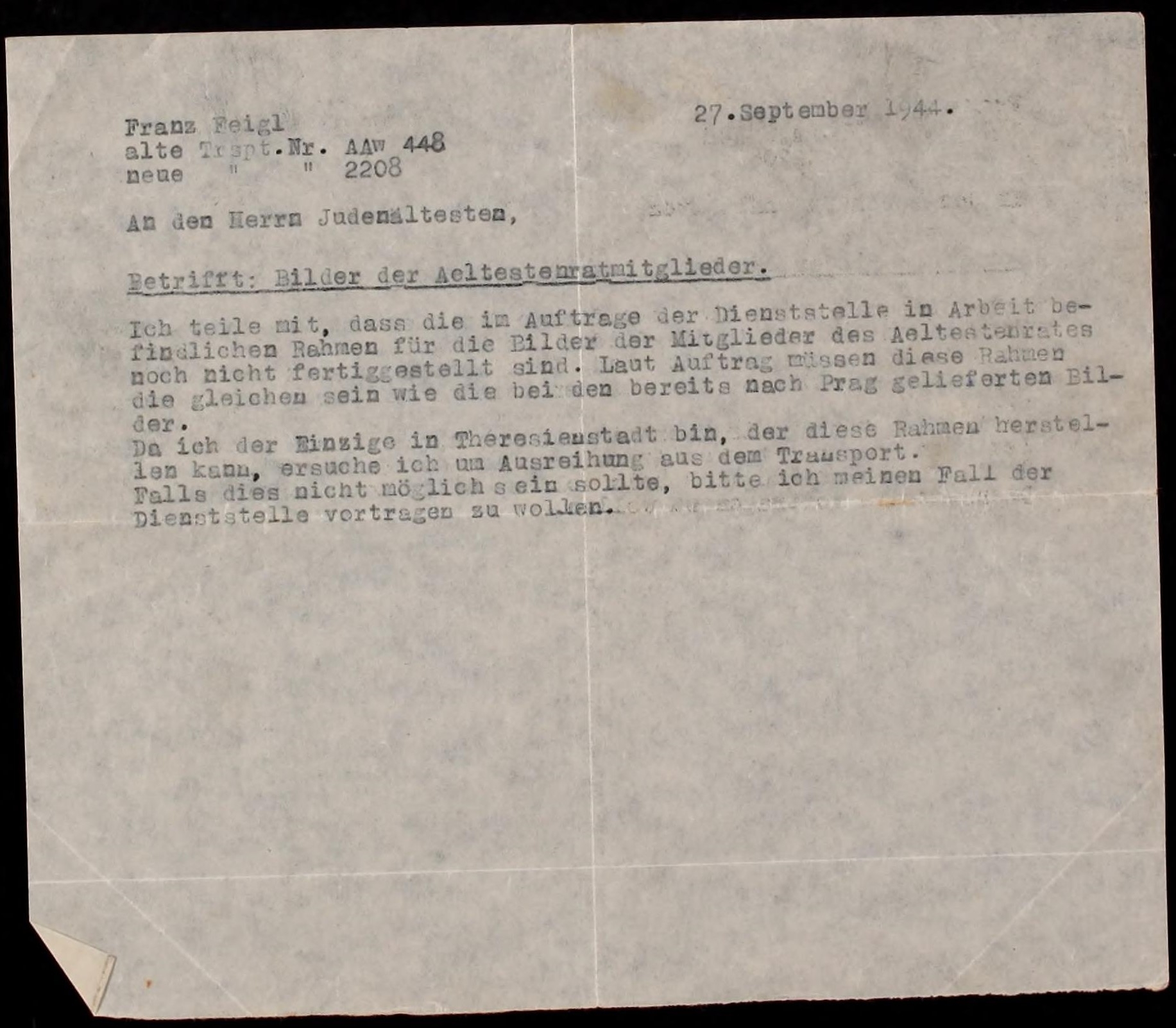 About the image: Franz Feigl and his wife, Anna, received multiple orders for deportation “to the East.” Franz wrote a letter on September 27, 1944 to the Council of Jewish Elders, asking for exemption from deportation because of his specialized skills in making picture frames. His appeal was granted, and Franz and Anna were spared.